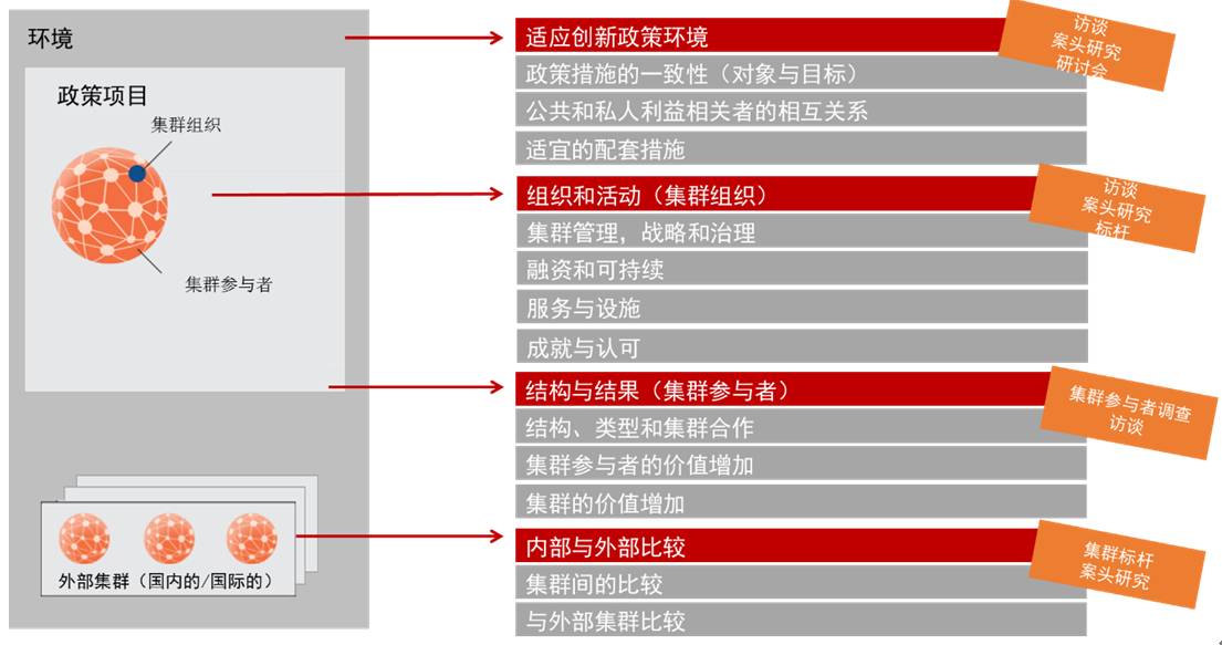 德國重視對集群及集群政策的評估,在相關集群項目執行中和執行后都有相應的評估,如尖端集群競賽、走向集群計劃等都進行了相應的評估。評估一般委托第三方進行。VDI-IT或VDE-IT作為德國聯邦政府多個部門的服務提供商,在集群管理、集群評估方面有著豐富的經驗,并在集群評估方面建立了一套比較完善、適用性廣的評估體系(見圖2)。