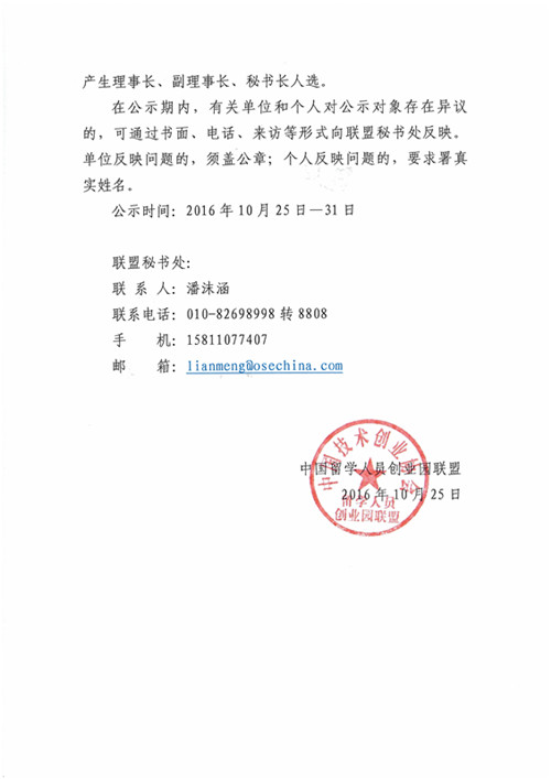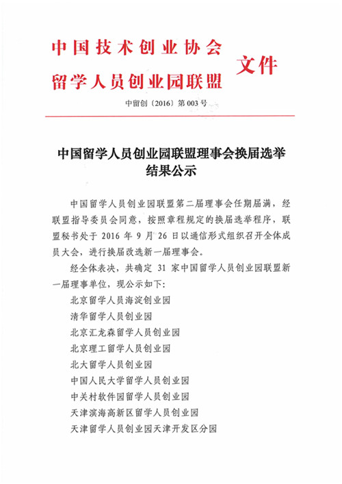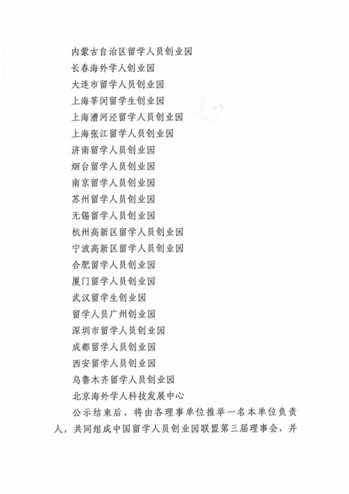 中國留學人員創業園聯盟理事會換屆選舉結果公示