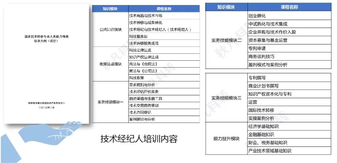 早在1997年,原國(guó)家科委就印發(fā)了《全國(guó)技術(shù)經(jīng)紀(jì)人培訓(xùn)大綱》,隨后的二十幾年期間,北京、上海、江蘇等省市紛紛制訂了各自的培訓(xùn)大綱。直到2020年3月,科技部火炬中心才對(duì)相關(guān)大綱進(jìn)行了修訂,并發(fā)布了《國(guó)家技術(shù)轉(zhuǎn)移專業(yè)人員能力等級(jí)培訓(xùn)大綱》(試行)。大綱融合新形勢(shì)下我國(guó)科技成果轉(zhuǎn)移轉(zhuǎn)化的新模式、新特點(diǎn),注重理論與實(shí)踐相結(jié)合、國(guó)內(nèi)與國(guó)際相結(jié)合,突出科學(xué)性、系統(tǒng)性和實(shí)用性,所列內(nèi)容既包括不同層次技術(shù)轉(zhuǎn)移從業(yè)人員應(yīng)知應(yīng)會(huì)的知識(shí)結(jié)構(gòu)、經(jīng)紀(jì)實(shí)務(wù)、案例實(shí)操等培訓(xùn)課程,也包括提升技術(shù)轉(zhuǎn)移從業(yè)人員知識(shí)素養(yǎng)的擴(kuò)展性選修課程,為分類評(píng)價(jià)技術(shù)經(jīng)紀(jì)人,引導(dǎo)技術(shù)經(jīng)紀(jì)人職業(yè)化發(fā)展方向奠定了基礎(chǔ)。