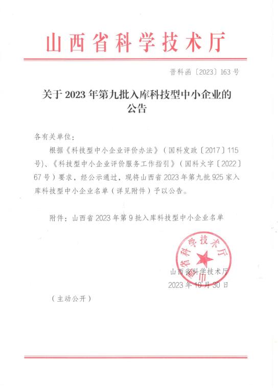 山西省2023年第9批入庫科技型中小企業名單公告