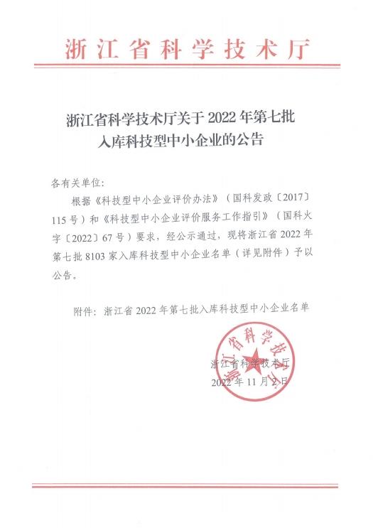 浙江省2022年第7批入庫科技型中小企業名單公告