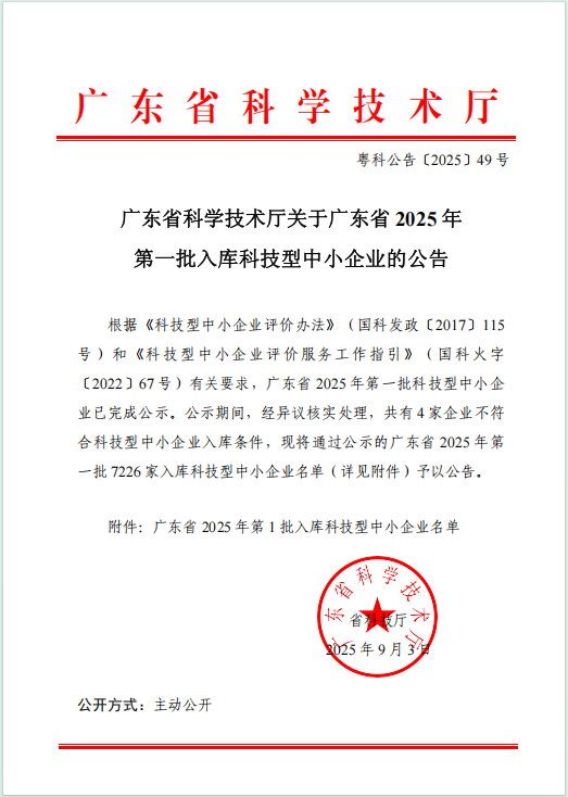廣東省2025年第1批入庫科技型中小企業名單公告