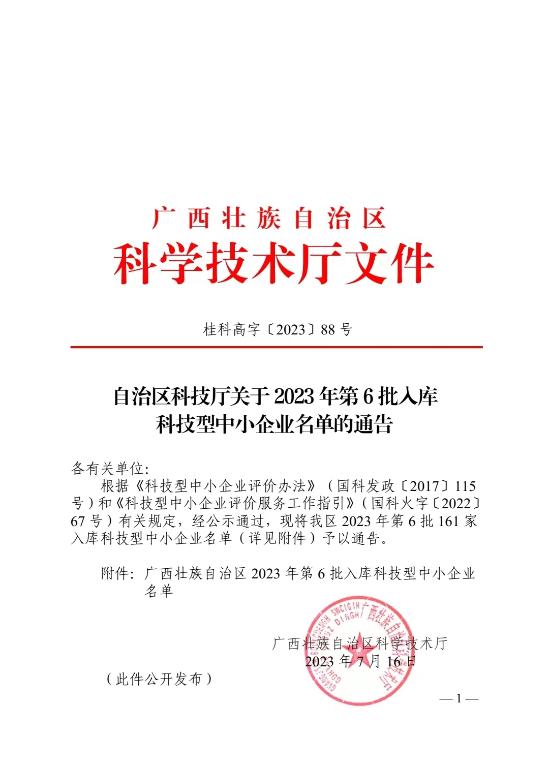 廣西壯族自治區(qū)2023年第6批入庫科技型中小企業(yè)名單公告