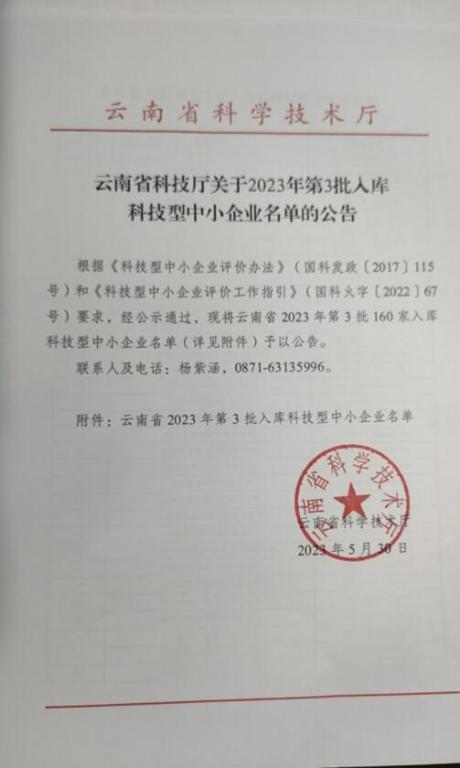 云南省2023年第3批入庫科技型中小企業(yè)名單公告
