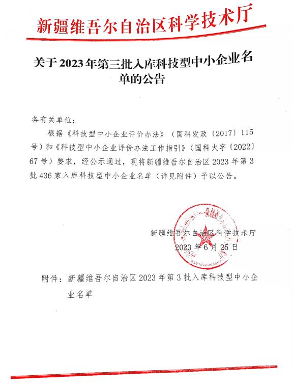 新疆維吾爾自治區2023年第3批入庫科技型中小企業名單公告
