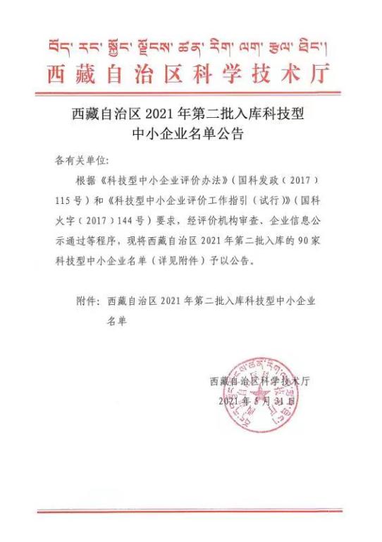 西藏自治區2021年第2批入庫科技型中小企業名單公告