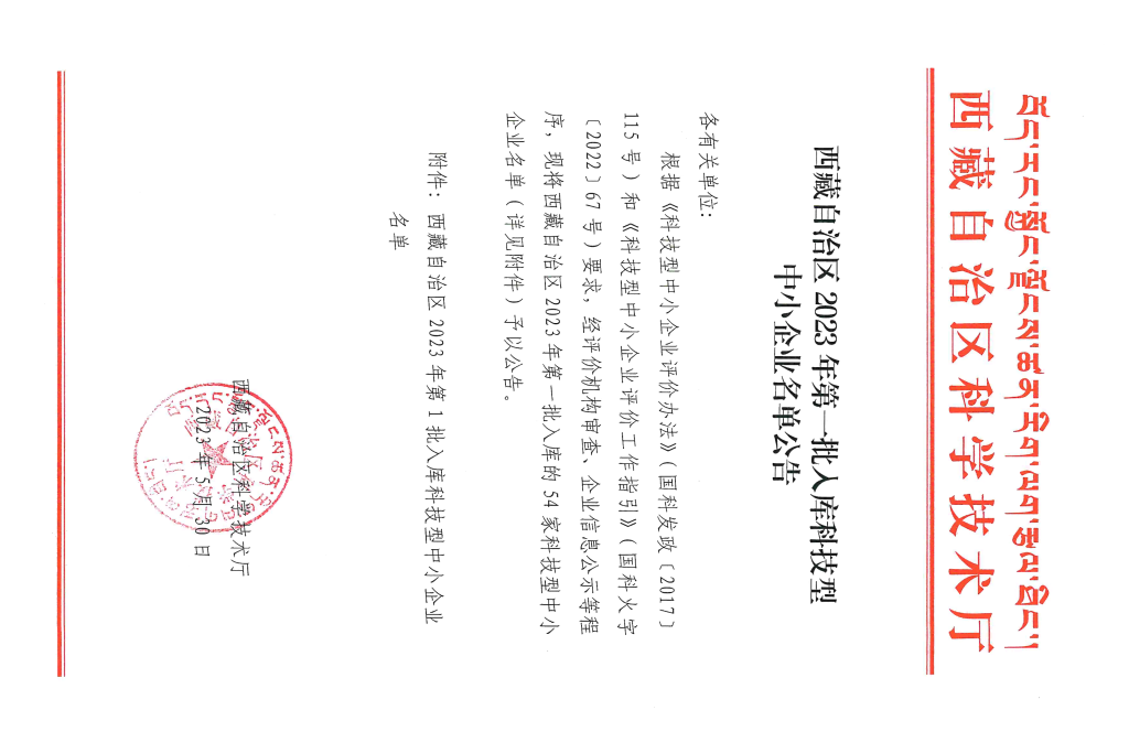 西藏自治區2023年第1批入庫科技型中小企業名單公告