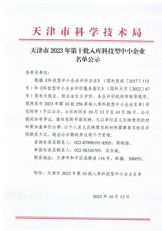 天津市2023年第10批擬入庫科技型中小企業名單公示