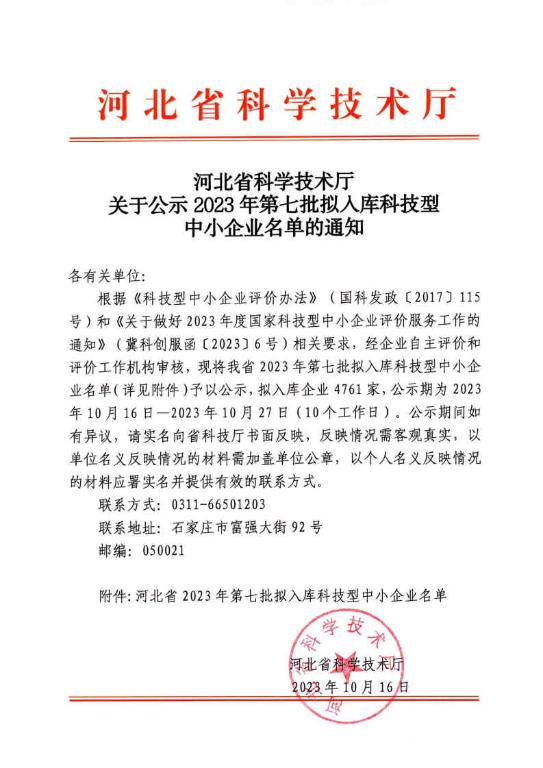 河北省2023年第7批擬入庫科技型中小企業(yè)名單公示