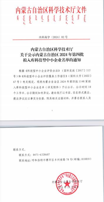 內蒙古自治區2024年第4批擬入庫科技型中小企業名單公示