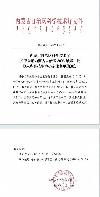 內蒙古自治區2025年第1批擬入庫科技型中小企業名單公示