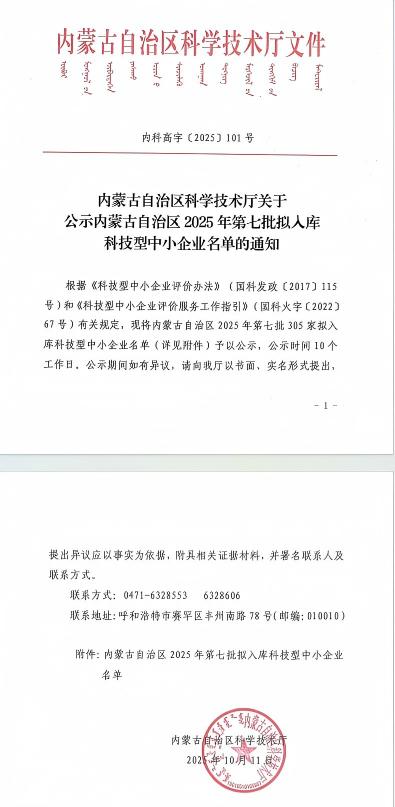 內蒙古自治區2025年第7批擬入庫科技型中小企業名單公示