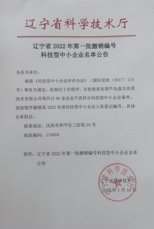 遼寧省2022年第1批撤銷編號(hào)科技型中小企業(yè)名單公告