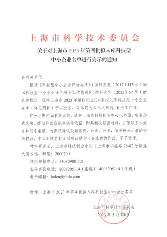 上海市2023年第4批擬入庫科技型中小企業名單公示