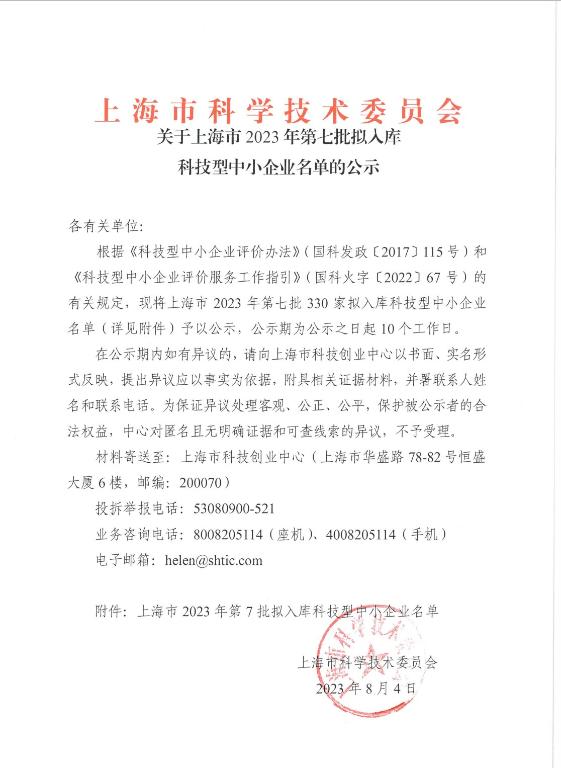 上海市2023年第7批擬入庫科技型中小企業名單公示