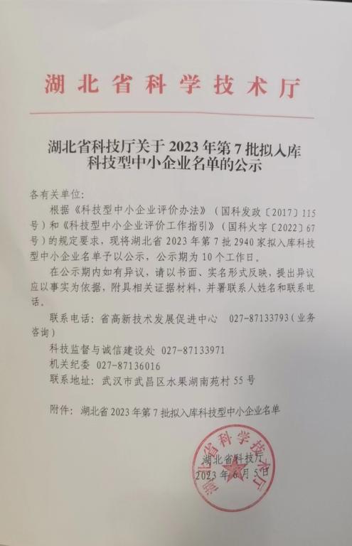 湖北省2023年第7批擬入庫科技型中小企業名單公示