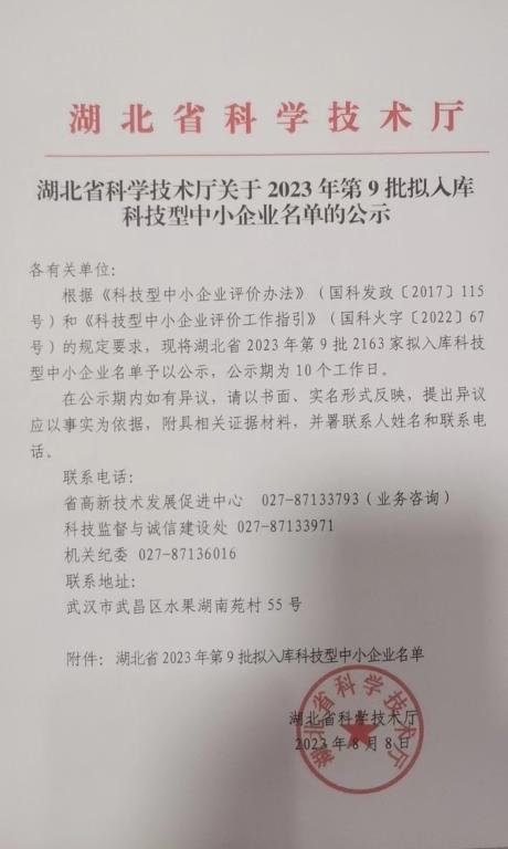 湖北省2023年第9批擬入庫科技型中小企業名單公示