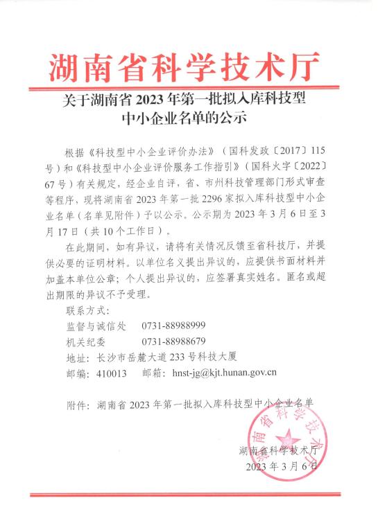 湖南省2023年第1批擬入庫科技型中小企業名單公示
