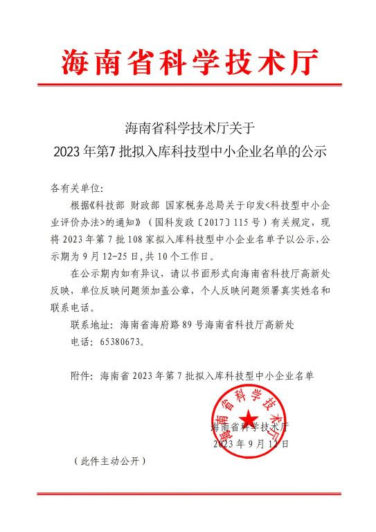 海南省2023年第7批擬入庫科技型中小企業名單公示