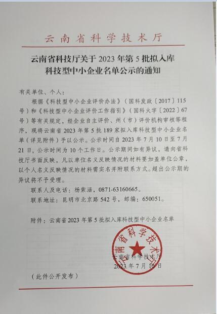 云南省2023年第5批擬入庫(kù)科技型中小企業(yè)名單公示