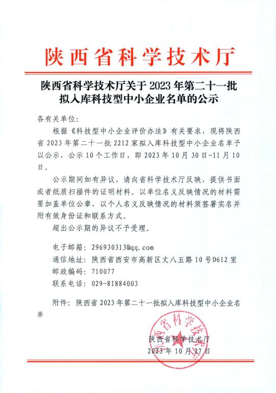 陜西省2023年第21批擬入庫科技型中小企業名單公示