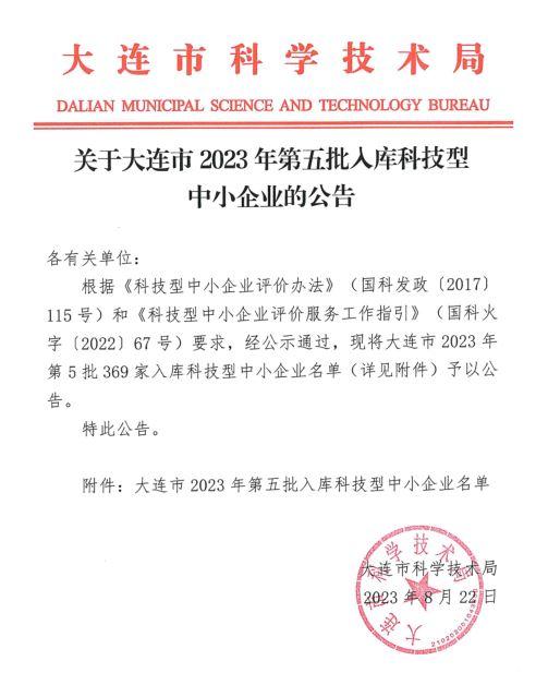 大連市2023年第5批入庫科技型中小企業名單公告