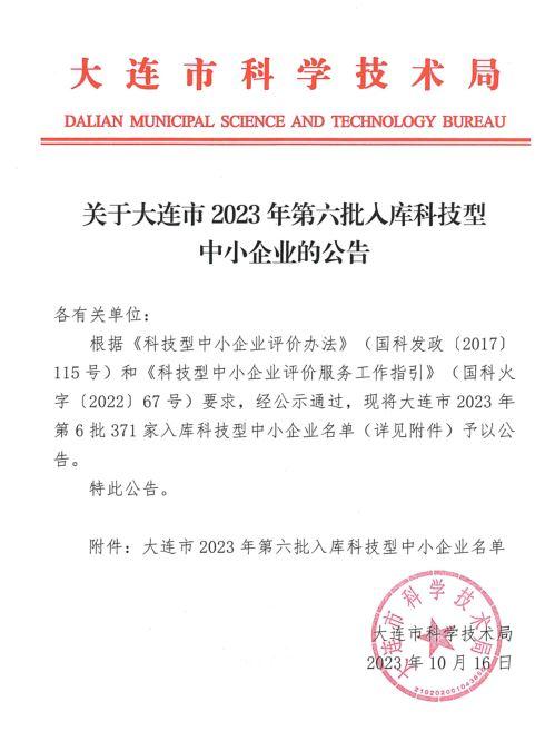 大連市2023年第6批入庫科技型中小企業名單公告