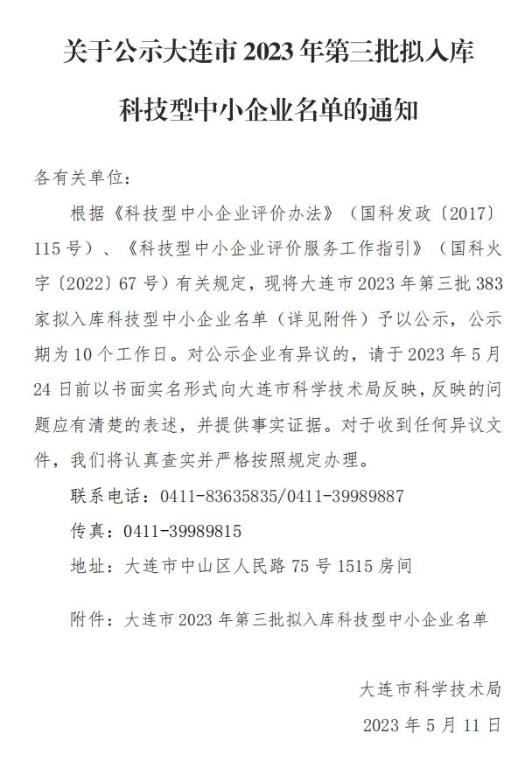 大連市2023年第3批擬入庫科技型中小企業名單公示