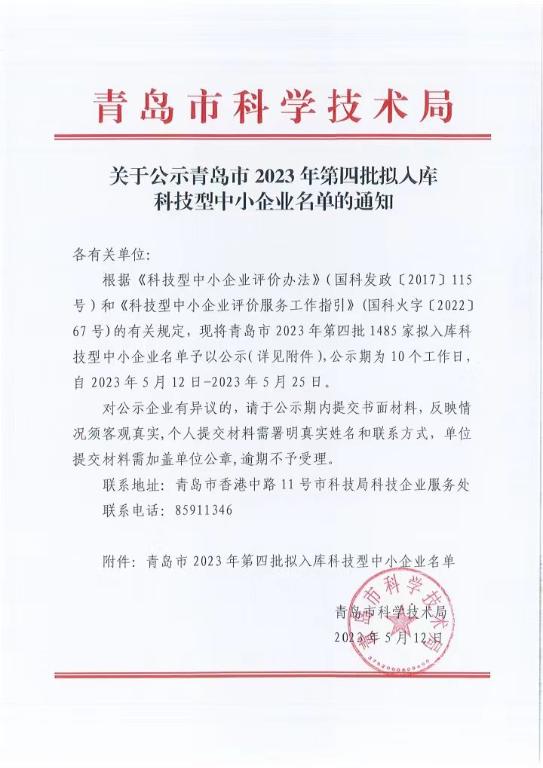 青島市2023年第4批擬入庫科技型中小企業(yè)名單公示