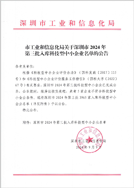 深圳市2024年第3批入庫科技型中小企業名單公告