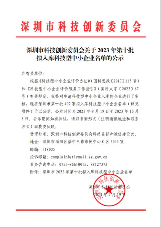 深圳市2023年第10批擬入庫科技型中小企業名單公示