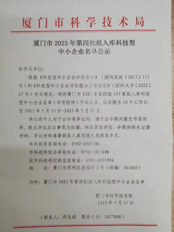 廈門市2023年第4批擬入庫科技型中小企業名單公示