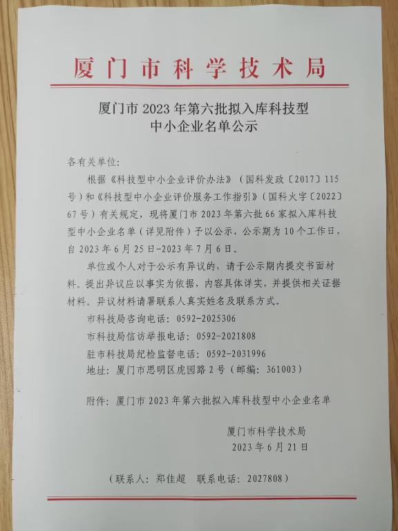 廈門市2023年第6批擬入庫科技型中小企業名單公示